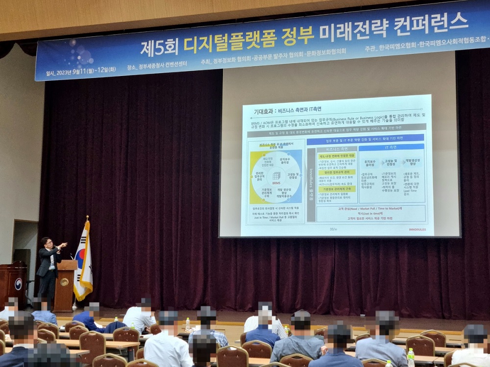 정부세종컨벤션센터에서 열린 ‘제5회 디지털플랫폼 정부 미래전략 컨퍼런스’에서 ‘디지털 플랫폼을 통한 혁신방안과 사례’에 대해 발표하는 이노룰스 김율한 상무